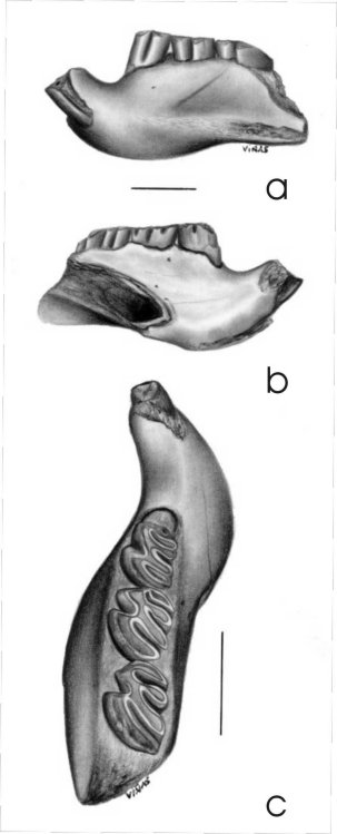 Fig. 1. Myocastor paranensis Ameghino 1885; MASP 737, un fragmento mandibular izquierdo con parte del incisivo y la serie dp4-m2. a: vista labial; b vista lingual; c. vista oclusal.