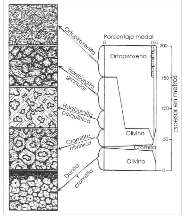 En la formación y evolución de estas intrusiones actúan diversos procesos físicos de cristalización y diferenciación produciendo: a) Bandeado: por segregación gravitacional, y b) Corrientes magmáticas convectivas, que producen capas gradadas. La gradación se debe, tanto a la depositación de cristales grandes, como a la concentración de minerales densos como magnetita, ilmenita, cromita, etc., en la base de las capas (Figs. 20-3 A y B).
