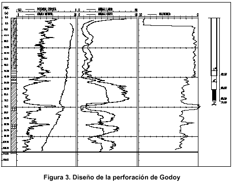 Construcción de una perforación de exploración de 7" de diámetro a rotación con muestreo continuo hasta alcanzar la base del acuífero Puelche, o una profundidad máxima de 100 m establecida por contrato. Se utilizó como inyección de perforación el aditivo biodegradable "regress" de manera de garantizar un rápido y adecuado desarrollo de la perforación, evitando la impermeabilización de las paredes por el uso de otros lodos del tipo bentonítico. El muestreo por "cutting" se realizó mediante tamiz normalizado #40, muestreando el lodo de inyección con el objeto de extraer muestras de terreno que fueron procesadas en laboratorio a fin de determinar las aberturas del filtro y el tamaño de grava para el prefiltro. En estas perforaciones se corrieron las herramientas de perfilaje múltiple (eléctricas y radiactivas).